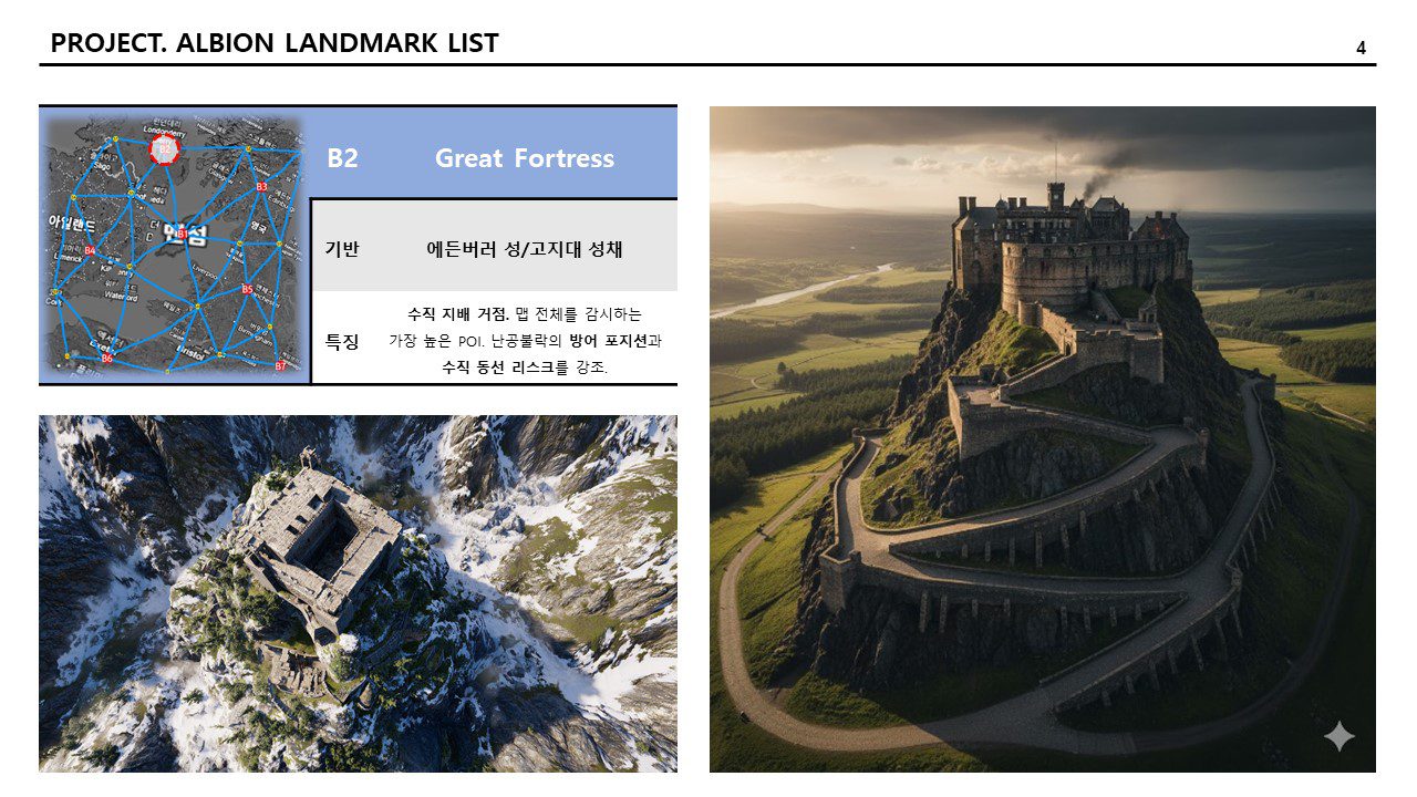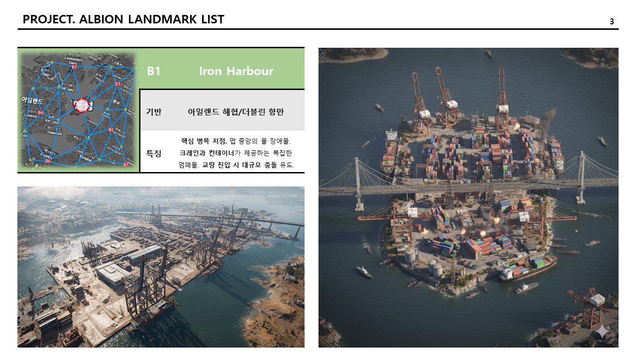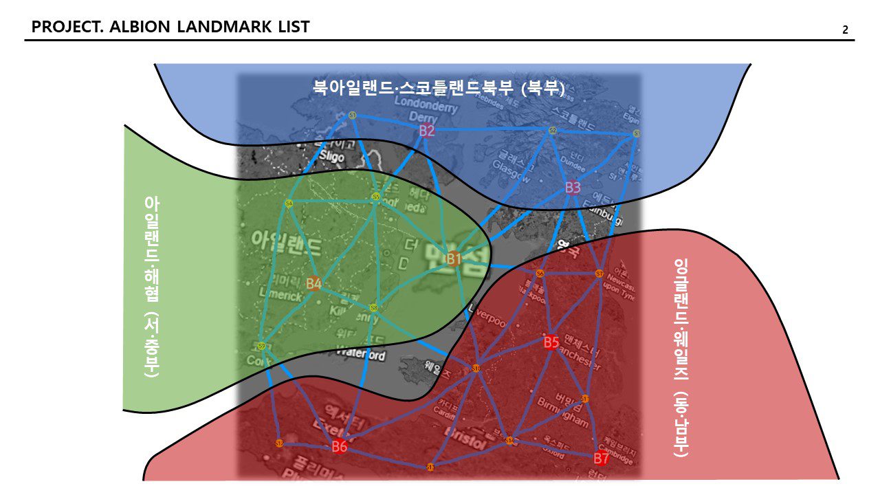 앞서 말한 바와 같이 현실적인 소스를 추가로 조사한 다음에 본격적인 레벨 디자인 작업을 시작한다. 그 이유는 “알비온”의 랜드스케이프 기반을 현실의 영국과 아일랜드를 바탕으로 시작했다는 점에서 일부 따르고자 하는 생각도 있고, 각 랜드마크 위치에서의 현실 요소들이 무엇보다도 가장 자연스러운 도시의 이미지라고 생각하기 때문이다.