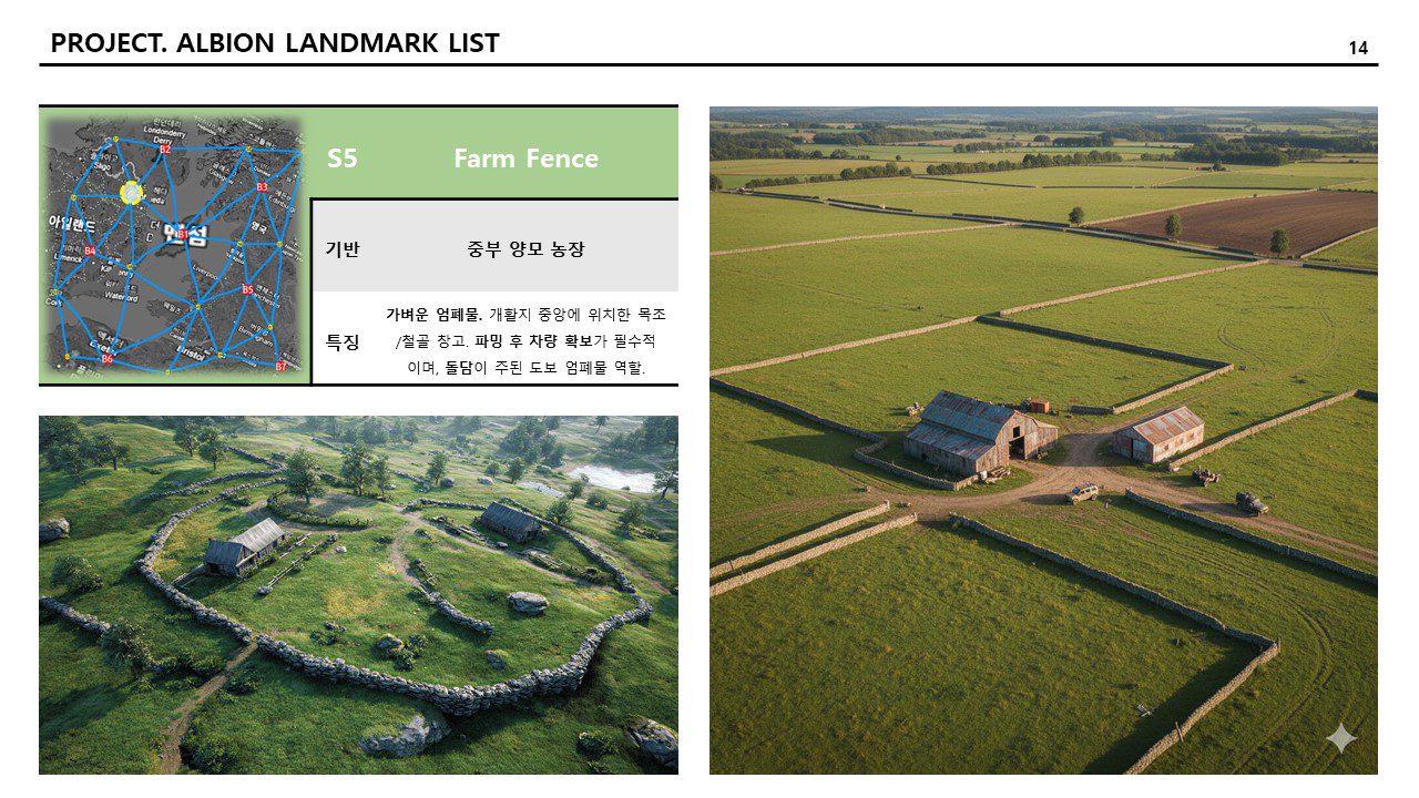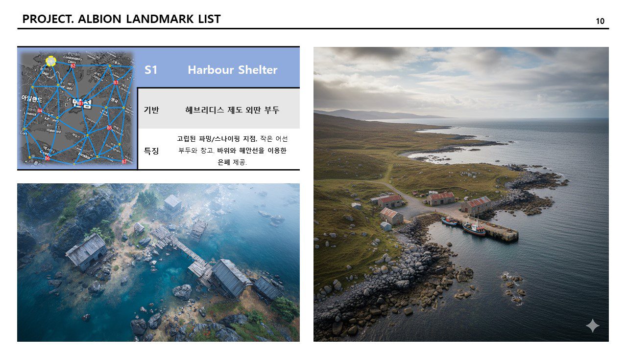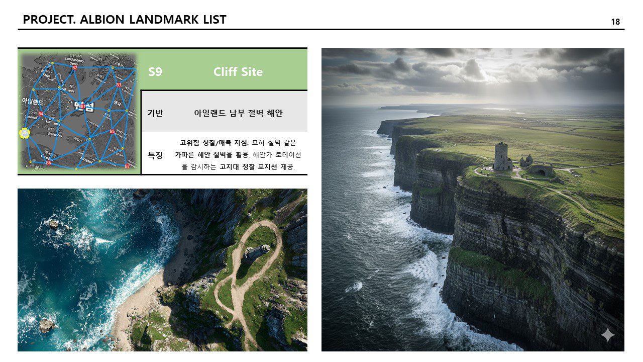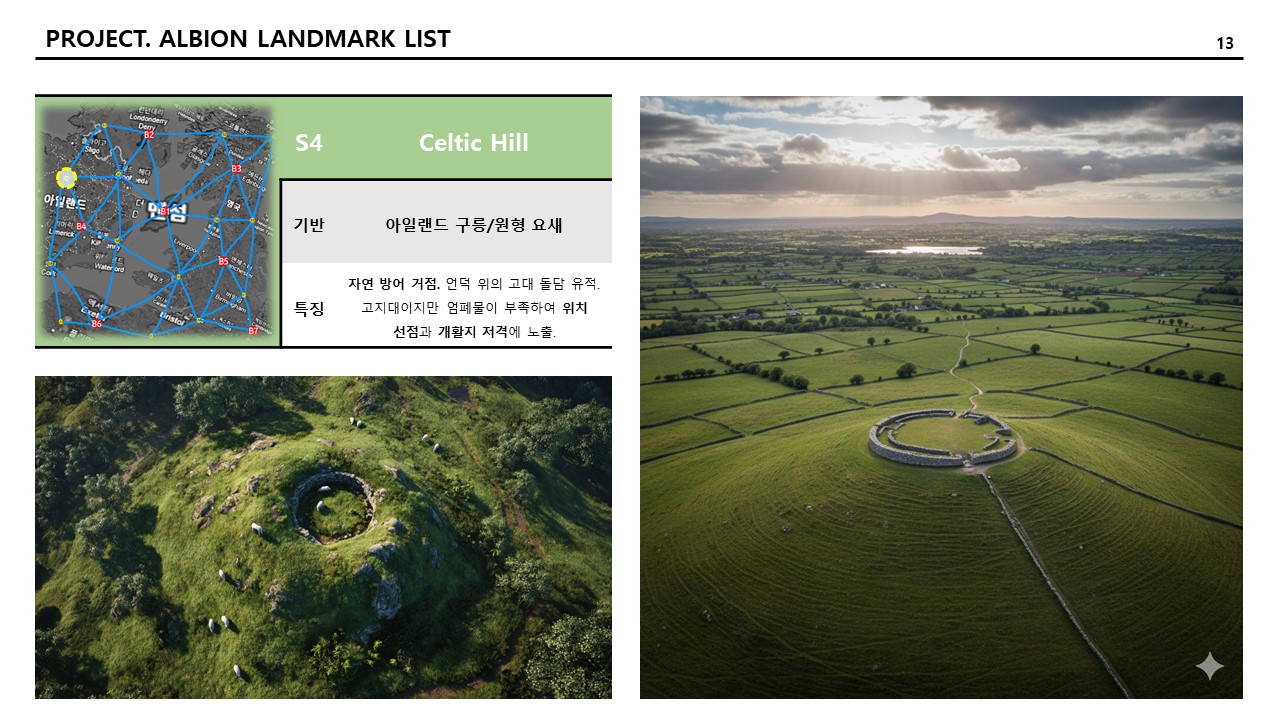앞서 말한 바와 같이 현실적인 소스를 추가로 조사한 다음에 본격적인 레벨 디자인 작업을 시작한다. 그 이유는 “알비온”의 랜드스케이프 기반을 현실의 영국과 아일랜드를 바탕으로 시작했다는 점에서 일부 따르고자 하는 생각도 있고, 각 랜드마크 위치에서의 현실 요소들이 무엇보다도 가장 자연스러운 도시의 이미지라고 생각하기 때문이다.