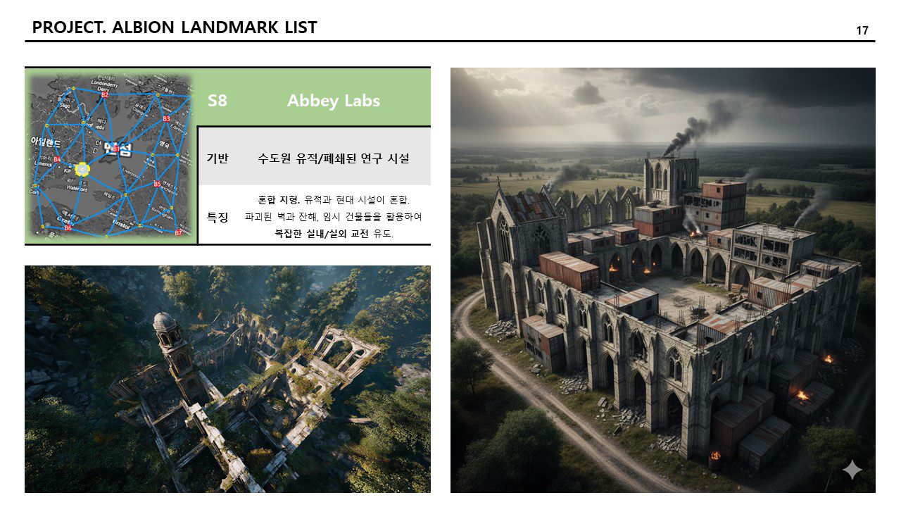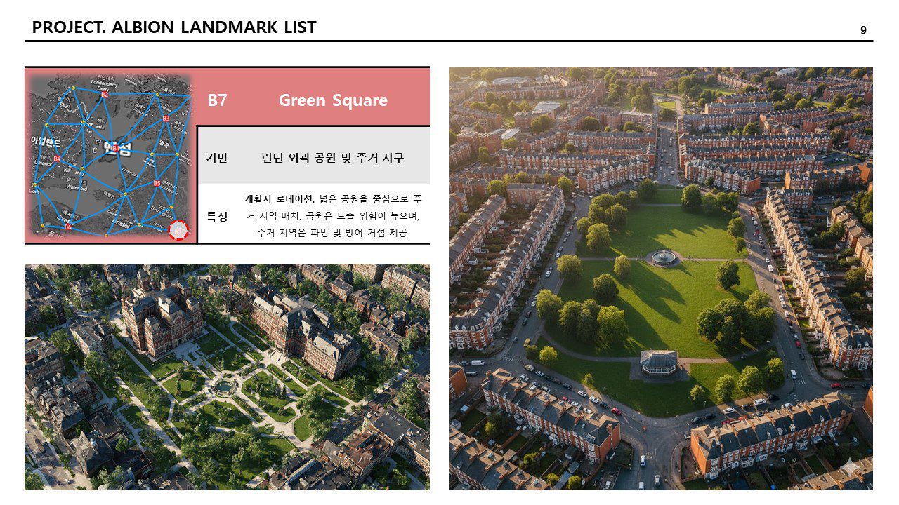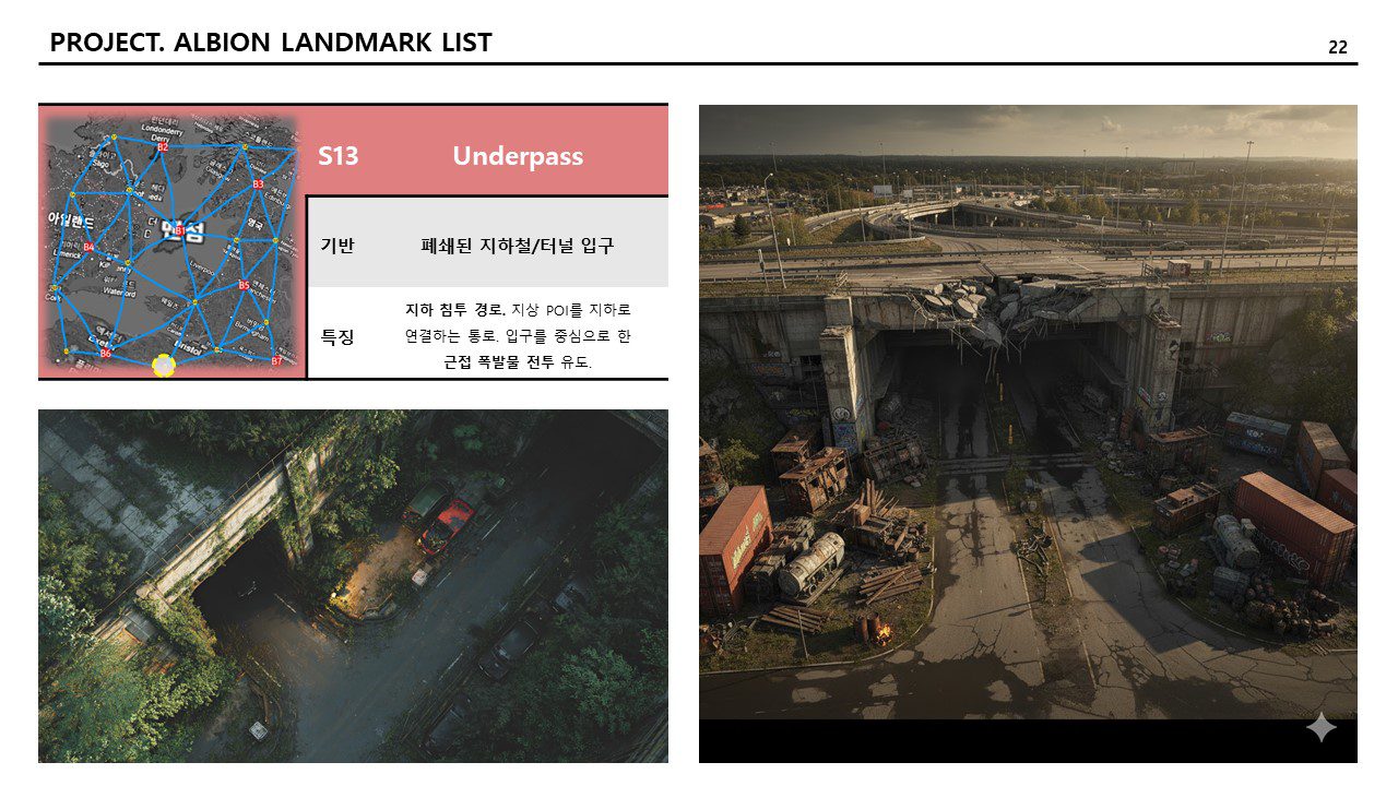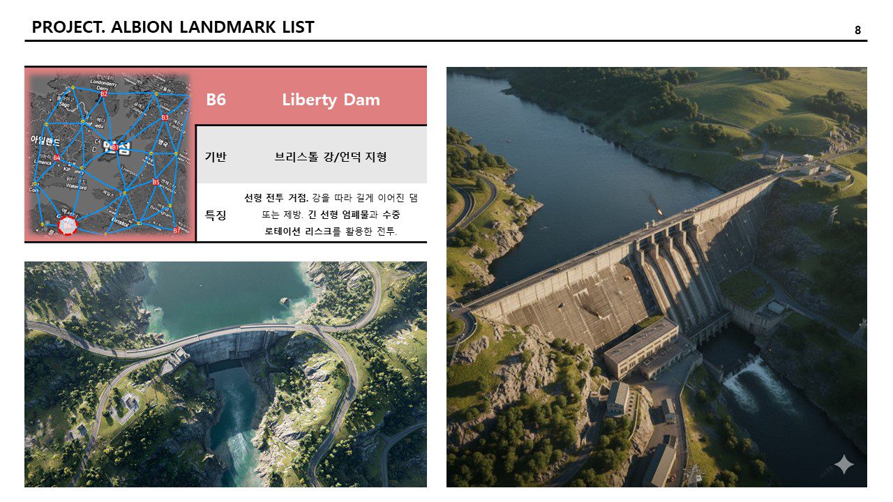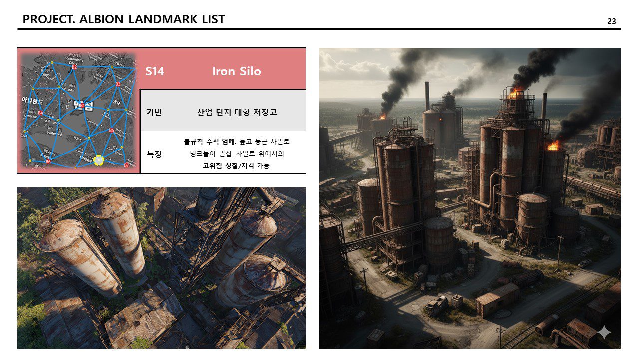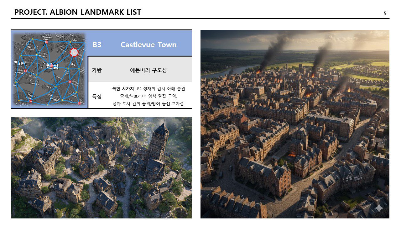각 21가지의 도시에 대하여 1페이지씩 할당하여 PowerPoint를 활용해 정리하고, 이 게시물에 이미지 형식으로 첨부하여 기록한다. 당장은 기획 및 AI 이미지로 초안을 다듬고, 현실 소스를 더욱 조사한 다음에 Unreal Engine 5를 활용한 레벨 디자인의 본격적인 작업을 시작하고자 한다.