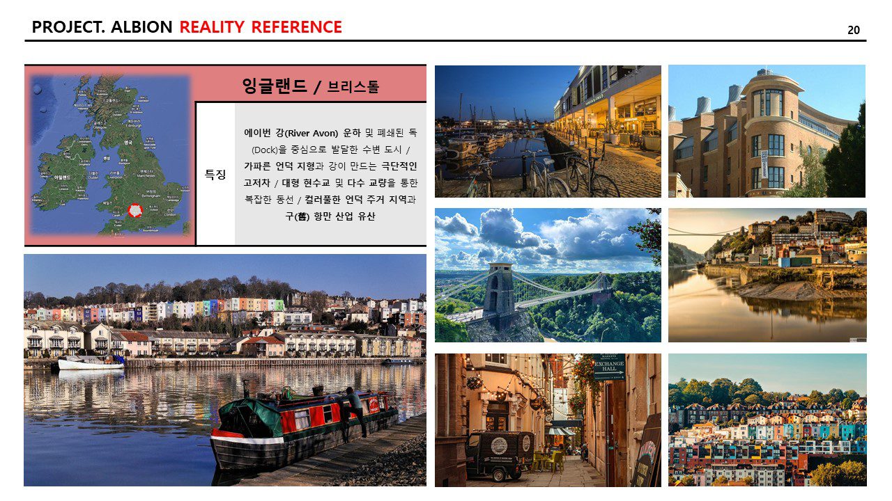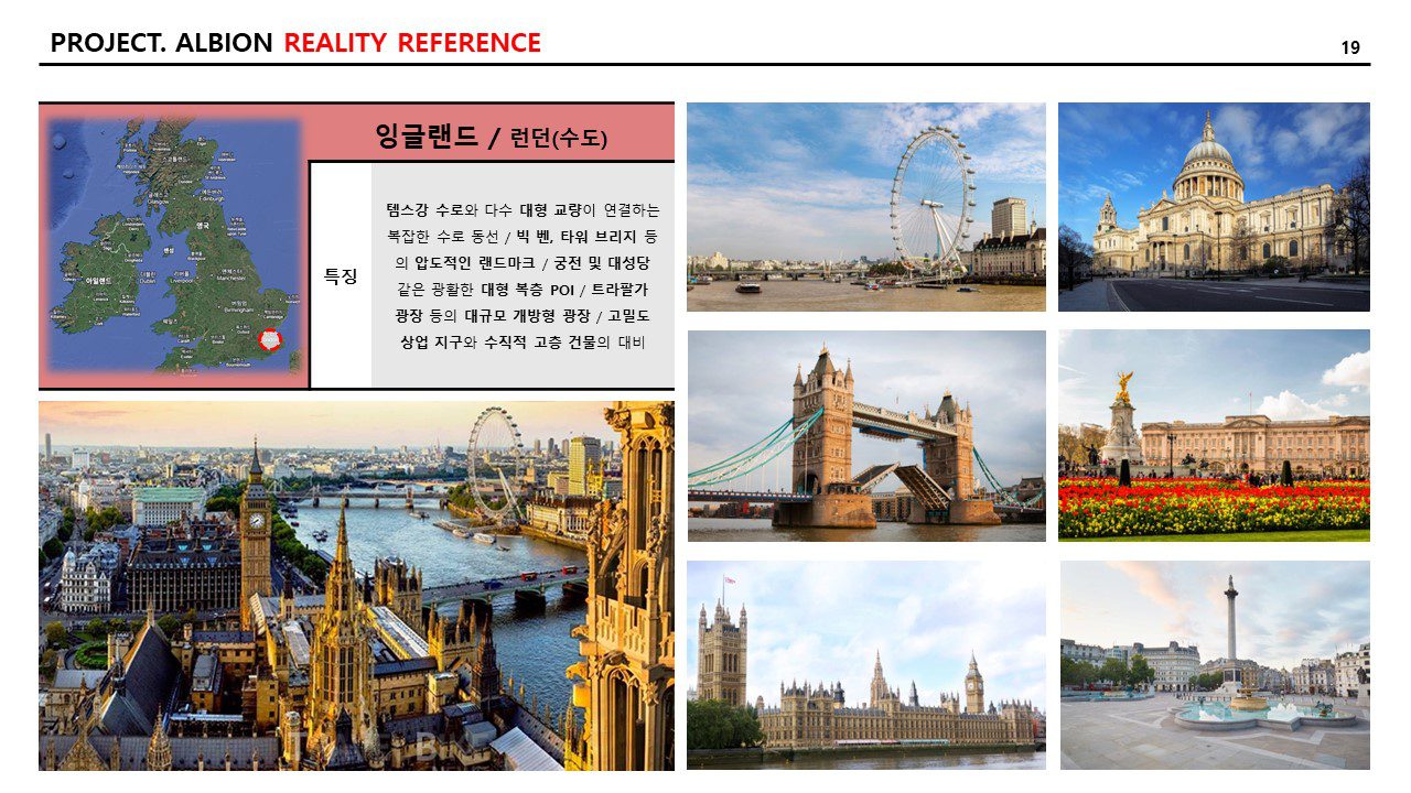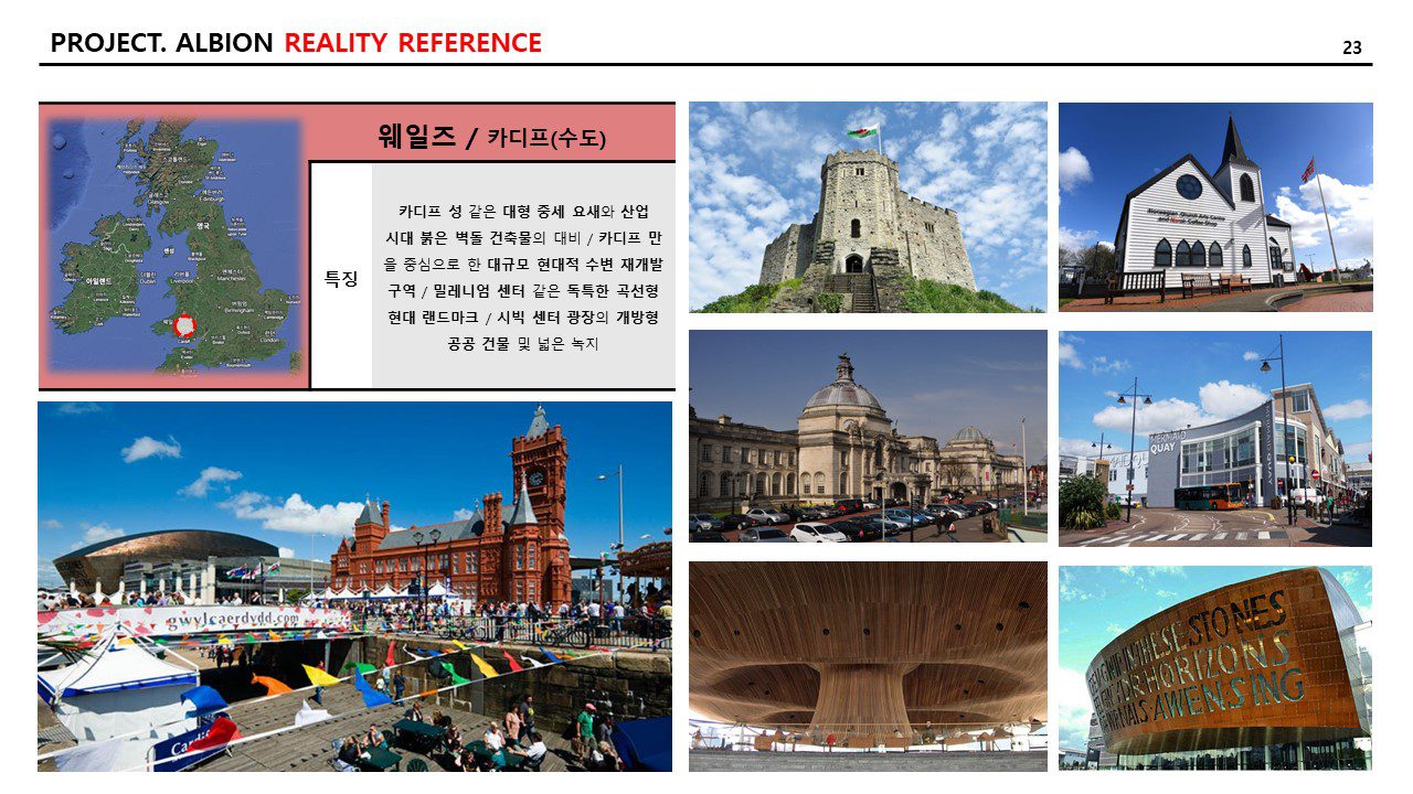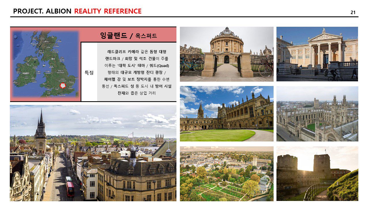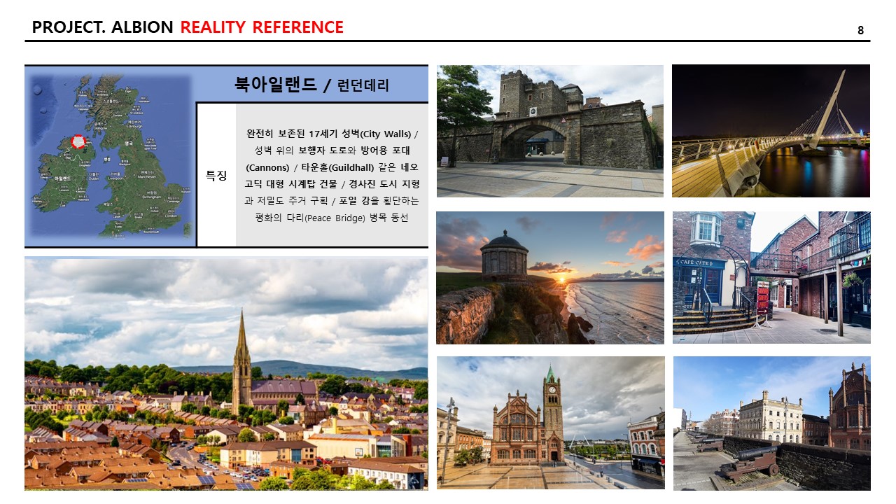 그리고 현실적인 참조 이미지와 특징 역시 추리다 보니, 21개의 도시가 나왔다. 일대일로 “알비온” 내의 랜드마크에 적용하고자 하는 의도는 없고, 지리적으로 다양한 곳의 도시를 선택하거나 문화적으로 발달한 도시를 선택하여 자료 조사를 다음과 같이 기록한다. 특징은 AI를 통하여 다듬은 자료를 옮겨 적었다.